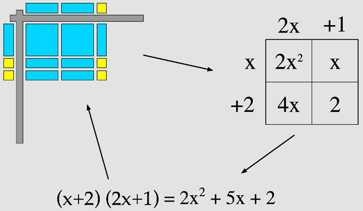 Here is a puzzle: make a rectangle, using two x2 blocks, five x blocks, and two ones. Write length × width = area for your rectangle. Figure 6.6 shows the resulting arrangement, and the corresponding symbolic representation in two formats.